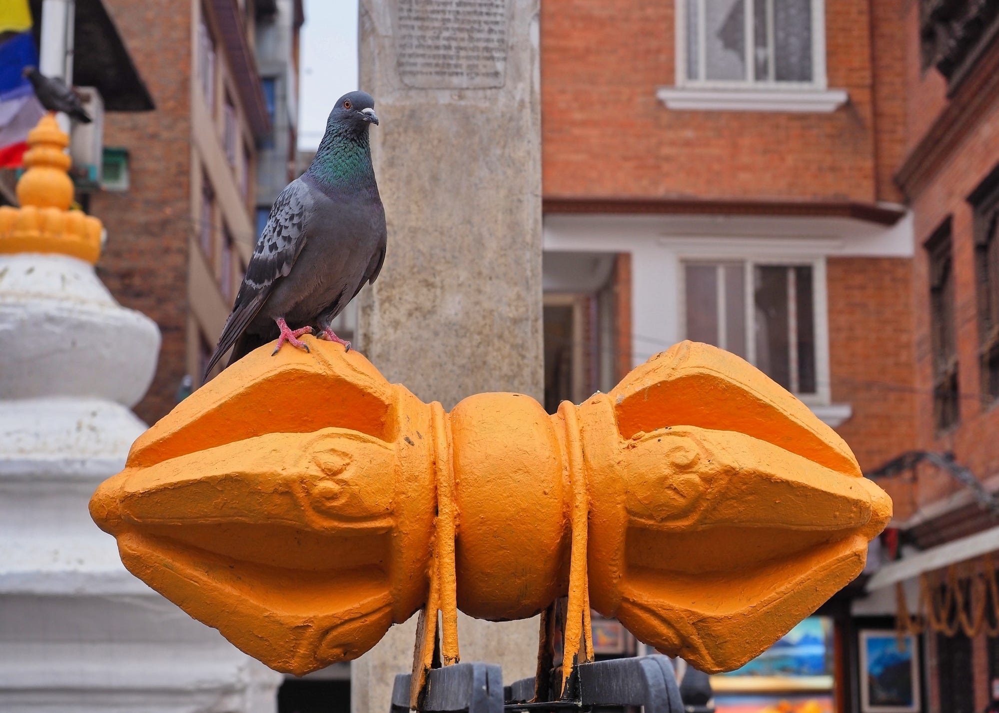 Voilà! I thought. Along with a follow-up question, that could be another post of value to From the Pure Land readers without me having to spend much time on it. Not only that, but I could work with my photo researcher, iStock, to find a nifty photo like the one of the pigeon perched on a vajra.